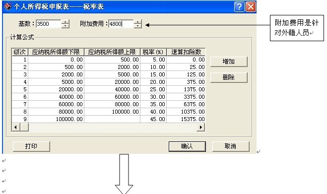 4、弹出个人所得税申报表。点击 增加、删除 按钮,可对照最新个人所得税税率表进行相应的增加、修改、删除操作。